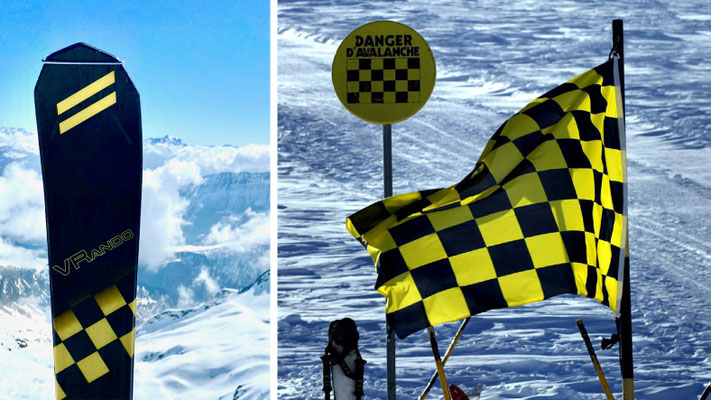 Le graphisme reprend la trame à damier noir et jaune des signalisations de piste de skis indiquant un éventuel risque d'avalanche. Disposé en oblique et parallèle aux double barres du logo Dynamic cette livrée jaune contracte avec le fond de ski noir.